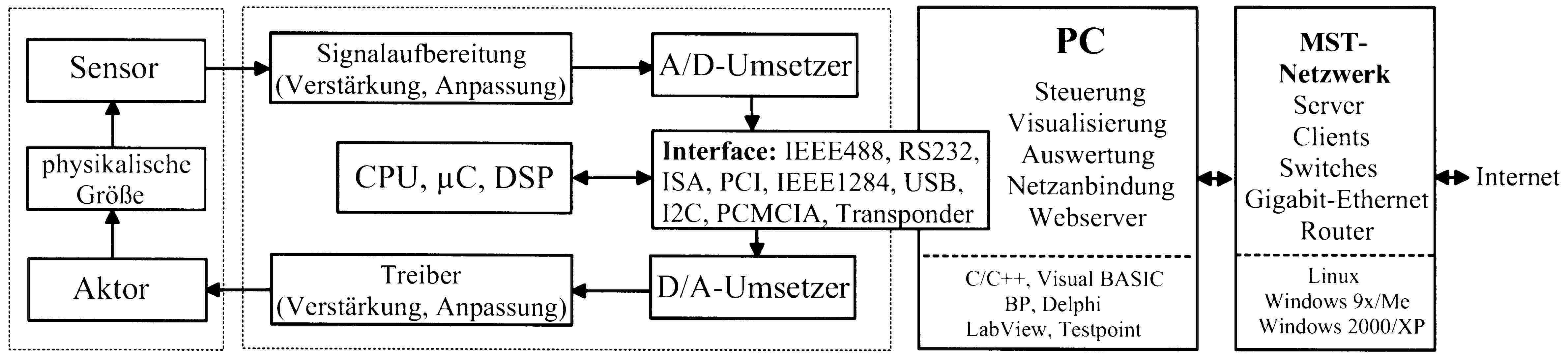 Die im Institut realisierten Systeme verfügen über analoge Schaltungen für die Signalaufbereitung, die sehr unterschiedliche Eigenschaften aufweisen müssen, und sie benötigen verschiedene Interfaces für die Gerätekopplung. Die Entwicklung von Interface-Schaltungen im weiteren Sinne ist daher ein wichtiger Bestandteil vieler aktueller Projekte, wofür vorwiegend Mikrocontroller und Personal-Computer zum Einsatz kommen. Mittlerweile existieren zahlreiche Eigenentwicklungen für serielle und parallele Schnittstellen (RS232, I2C, IEEE1284), den ISA-, den PCI-Bus, PCMCIA, IEEE1394 sowie für den Universal Serial Bus. Hiermit lassen sich alle relevanten Interfaces für Anwendungen in der Mess-, Steuer- und Regelungstechnik mithilfe von A/D- und D/A-Umsetzern, Signalverstärkern, Port-Expandern sowie Strom- und Spannungsquellen abdecken, die in den verschiedenen Mikrosystemen zum Einsatz kommen. Die drahtlose Erfassung von Sensordaten erfolgt anhand aktiver und passiver Transpondersysteme (125 kHz, 13.56 MHz, 2.4 GHz) sowie auf der Basis von Bluetooth und mit Ultraschall. Applikationen für die Medizintechnik bilden dabei einen Schwerpunkt. Die gemessenen Daten werden von Basisstationen aufgenommen und über Schnittstellen an Personal Computer geleitet, wo die Messwerte entsprechend ausgewertet, visualisiert und weiterverarbeitet werden können. Aktuelle Designs werden vorwiegend in der Surface Mounted Technology (PLCC, BGA) realisiert, was zu sehr kompakten Lösungen führt. Des Weiteren werden laufend Applikationen für die allgemeine PC-Messtechnik sowie Hard- und Software für die Fehlersuche und -Behebung in PC-Systemen entwickelt, was sich auch in zahlreichen Veröffentlichungen zur angewandten PC-Technik niederschlägt. Publikationen